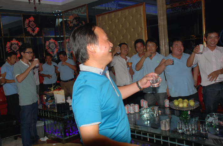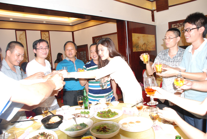 晚宴中,連總逐一席次致酒,并滿心歡悅的與在座員工話今昔,展望公司未來。各部門同事間也甚是親密,相互把酒言歡。