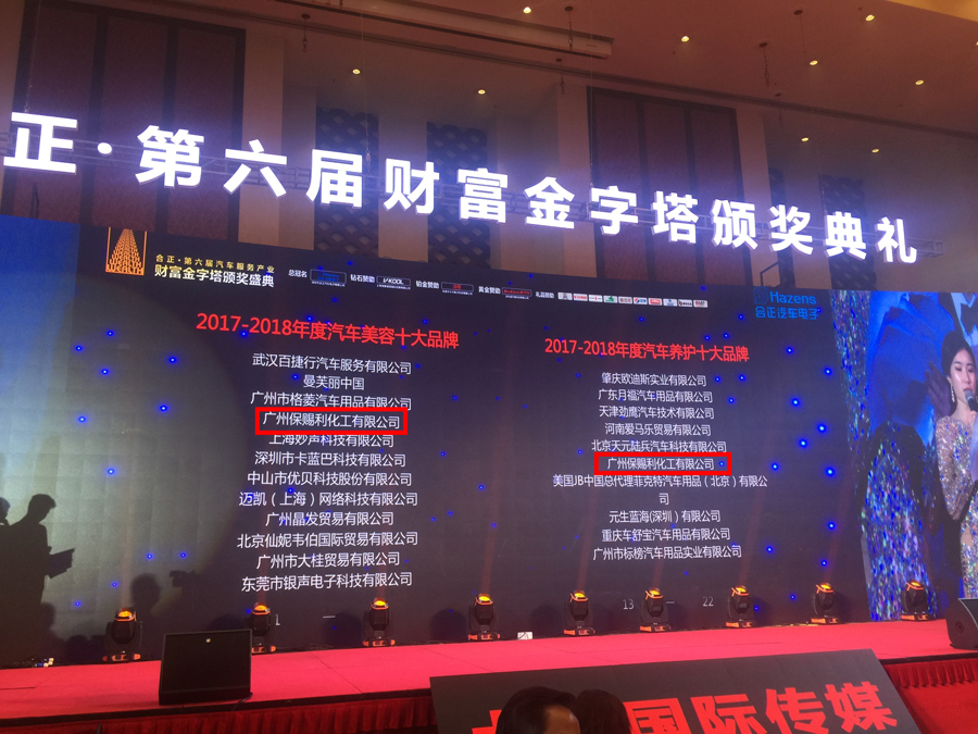 在全行業聚焦的盛會上,在中國汽車后市場行業精英、媒體朋友們的共同見證下,保賜利憑借強大的品牌實力榮獲“2017-2018年度汽車美容十大品牌”和“2017-2018年度汽車養護十大品牌”榮譽。